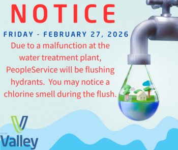 Due to a malfunction at the water treatment plant, PeopleService will be flushing hydrants. You may notice a chlorine smell during the flush.