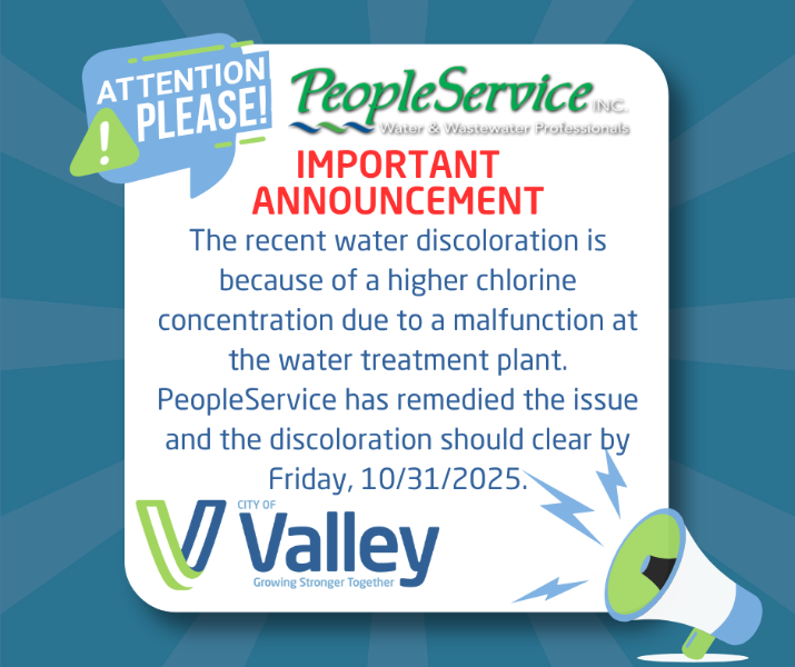 The recent water discoloration is because of a higher chlorine concentration due to a malfunction at the water treatment plant. PeopleService has remedied the issue and the discoloration should clear by Friday, 10/31/2025.